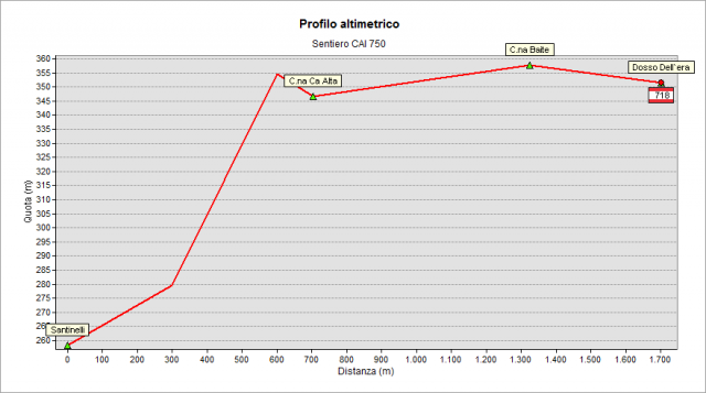 Der Pfad beginnt in Tremellini Ortschaft (Foresto Sparso Gemeinde) (253 m), vor der Kreuzung mit der Straße nach San Giovanni, und steigt aus einer engen Straße in den Weinbergen. Der Pfad führt durch hügelige Wiesen, Robinien - und Kastanienwälder mit einem üppigen Unterholz. Man kommt bald zur Dosso dell'Era Ortschaft (357 m), wo er den Pfad 718 kreuzt. Von hier aus kann man die Gemeindestraße nehmen in Collepiano Richtung (462 m), wo der Pfad 717 beginnt.