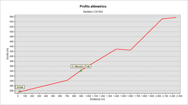 Il sentiero segnato parte da via Nazionale, vicino al torrente Borlezza, nell'abitato di Lovere. Si percorre la strada asfaltata sino al Colle di San Maurizio (350 m) dove si trova una Cappella (con un pregevole affresco del XV secolo, "Madonna in trono con il bambino") e un convento dei Frati Francescani. Il percorso si svolge nel bosco con leggera pendenza, supera il Monte Cala e termina al Passo delle Croci (550 m) dove incrocia il sentiero 552.