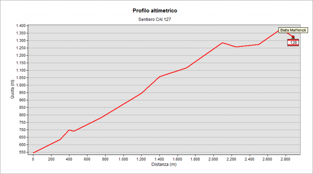 Il sentiero parte a Cugno di Sotto (535 m), frazione posta all'inizio dell'abitato di Olmo. Si attraversa il fiume Brembo e si inizia a salire nel bosco (nel punto in cui si abbandona la stradina sterrata e inizia il sentiero, si trova la partenza del sentiero 127A, che porta a Piazza Brembana); il 127 sale nel bosco del "Canale della Cassa" (lato destro, sinistro orografico). Proseguendo l'ascesa si arriva infine alla sommità del vallone in località "Il Collino" (1290 m), da qui il sentiero prosegue per un tratto pianeggiante fino al roccolo Rugio e poi, per una breve salita, giunge a baita Maffenoli (1367 m), dove si incrocia il sentiero 128 che sale da Piazza Brembana e porta a Cespedosio.