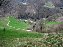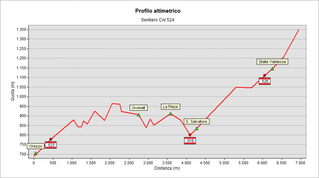 Il sentiero inizia in località Os-ciöl, raggiungibile direttamente da Orezzo seguendo il sentiero 523 fino alla località suddetta (tabella multidirezionale). E’ un percorso facile e riposante con pochi dislivelli fino in Val de Gru. Si snoda in gran parte tra i boschi di faggio che ricoprono tutto il versante nord del M. Cedrina. Giunto nella valle, guada il torrente, sale verso l’abitato e, superatolo, giunge in località Foppa. Da qui svolta a destra ed entra in un fitto bosco, giungendo in breve alla località La Mandra, dove incrocia il sentiero 525 diretto al M. Alben. Sale poi ulteriormente sino a raggiungere (nei pressi della Stalla Suchello) il sentiero 519 nel suo tratto che corre sul crinale tra il Forcellino e il M. Suchello.