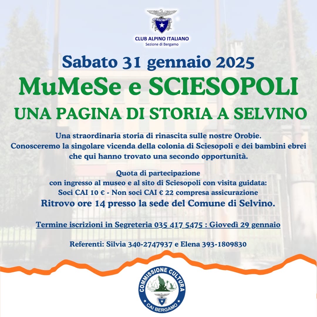 Commissione cultura Sabato 31 Gennaio Cosa Uscita in ambiente Una straordinaria storia di rinascita sulle nostre Orobie. Conosceremo la singolare vicenda della colonia di Sciesopoli e dei bambini ebrei che qui hanno trovato una seconda opportunità. Allegati 9e6c55ba-f0f7-4a0d-ab46-a9a232ffee65.pdf Quando Quando Sab, 31/01/26, 14:00 - 18:00 Partecipare Quote di partecipazione Socio CAI 10,00 Non socio compresa assicurazione 22,00