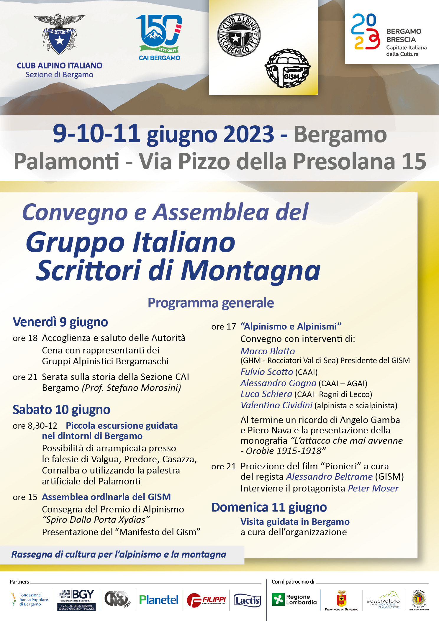Ore 18: accoglienza e saluto delle Autorità, a seguire ore 21: Serata sulla storia della Sezione CAI Bergamo ( prof. Stefano Morosini)