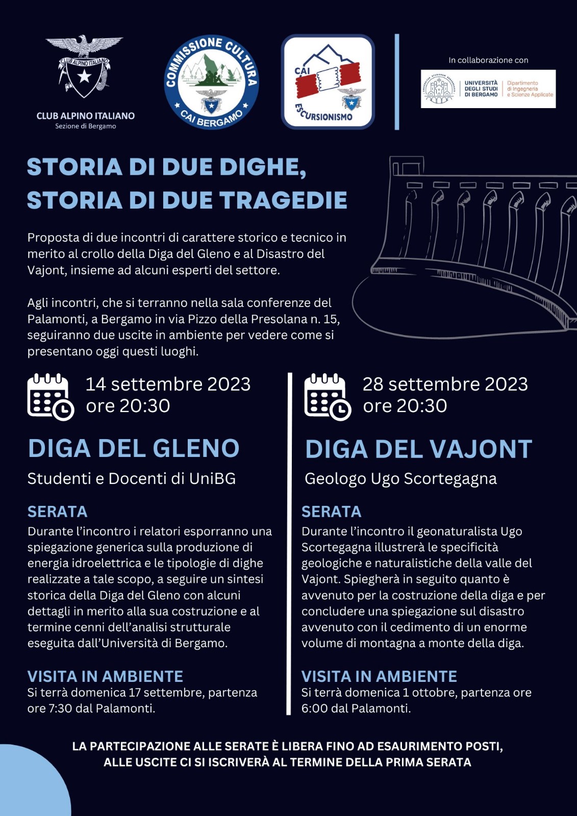 Proposta di due incontri di carattere storico e tecnico in merito al crollo della diga del Gleno (1923) e al disastro del Vajont (1963), insieme ad alcuni esperti del settore.