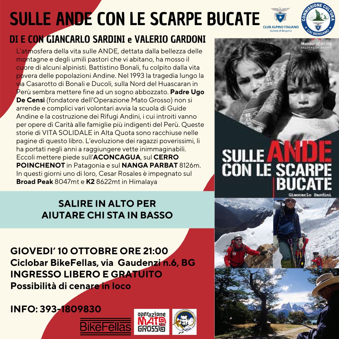 SULLE ANDE CON LE SCARPE BUCATE di e con Giancarlo Sardini e Valerio Gardoni presso Ciclobar Bike Fellas via Gaudenzi 6 Bergamo - Possibilità di cenare in loco prenotando Cell. 393 1809830 - Ingresso libero