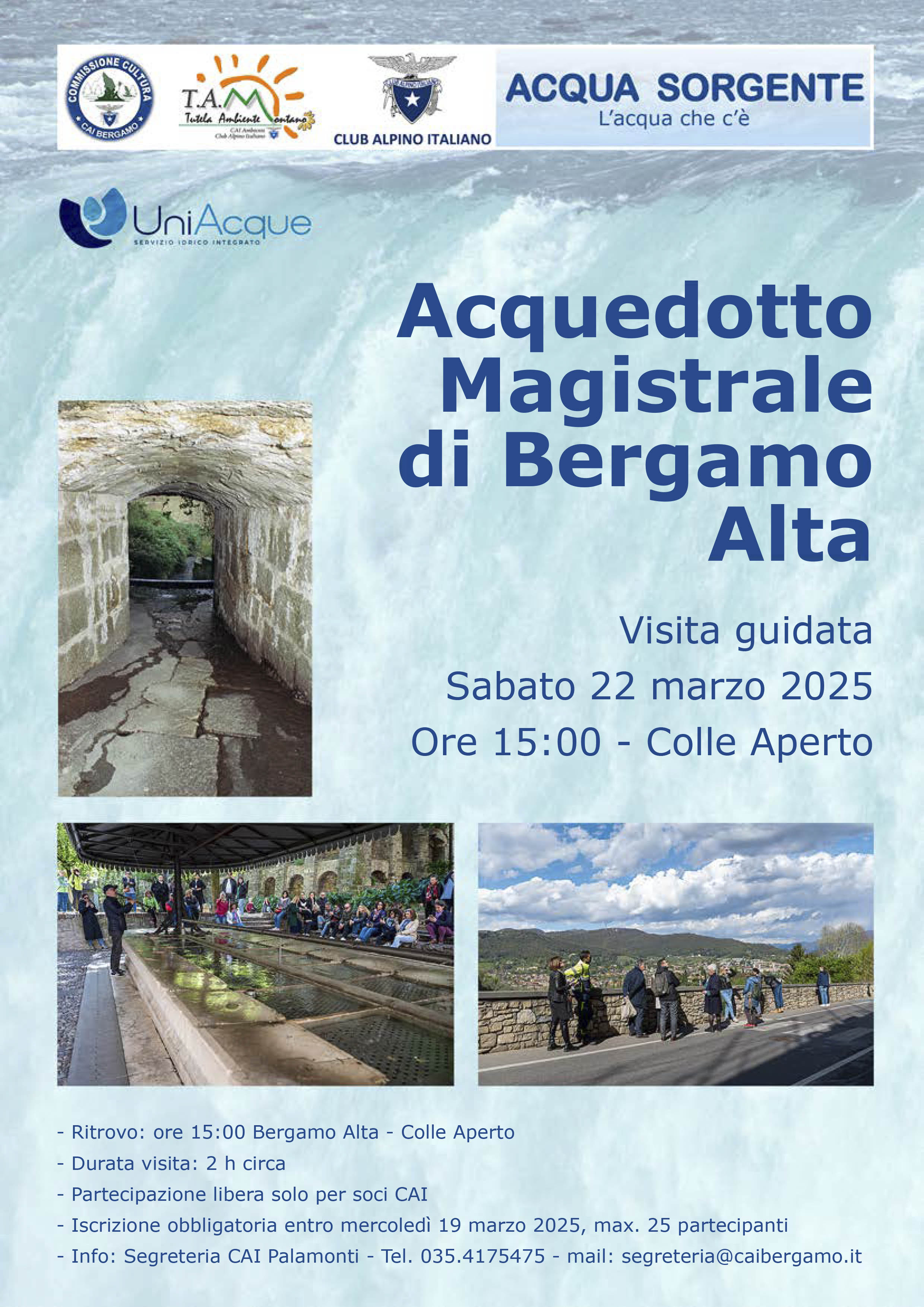 La visita guidata a cura di UniAcque ci condurrà alla scoperta dell'antico Acquedotto Magistrale il cui percorso, dopo avere raccolto acque e sorgenti presenti nei colli di Bergamo, partiva dalla porta Sant'Alessandro ed alimentava fontane, cisterne e lavatoi in città alta.