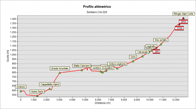 Starting near the Town Hall of Ardesio (“Pro Loco” headquarters, about 600 meters a.s.l.), the path goes down to the Serio river and cross it near the hydroelectric power plant. Then it rises for a while - following the road towards Cacciamali / Cerrete hamlets - up to reach the road that leads to the Alpini’s Chapel. After passing the chapel, there is the steepest part of the path: the trail climbs up to an altitude of about 800 m, until you reach a forest road. Now the path levels out and enters Valcanale (the valley).
