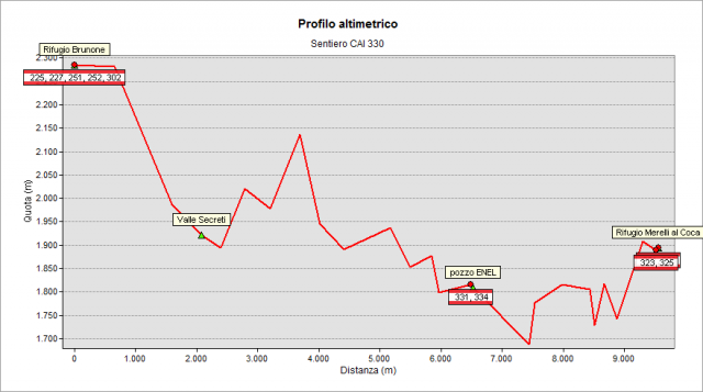 Starting from Brunone Hut (2295 m) follow path n° 302 for a few minutes, then turn right and lose altitude. Cross the “dei Secreti” valley and continue the climb to reach a col at an altitude of 2002 m and - after another stretch along the mountainside - you finally face the Seriana valley at “della Giraffa” Col (2125 m). Continue along the ruins of Ecla farm (1900 m) and Cavallo Col (1930 m), to arrive at the intersection with path n° 334 and path n° 331 at “il Pozzo” ENEL (a strange construction - a water collection system - 1800 m: here arrive all the collection channels feeding the forced pipeline that goes down to the “dei Dossi” hydroelectric power plant). Continue along the mountainside – through the meadows placed at the base of “Pizzo Castello” peak until to reach a stretch dug into the wall (equipped by a chain) that has been reopened and secured in spring 2017 (such section had been closed for some years, obliging a detour). The path – yet aerial and along the mountainside - leads below “Merelli al Coca” Hut (1892 m) which is finally reached by a last short climb.