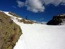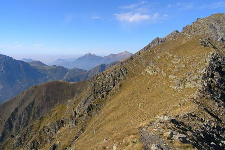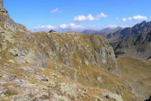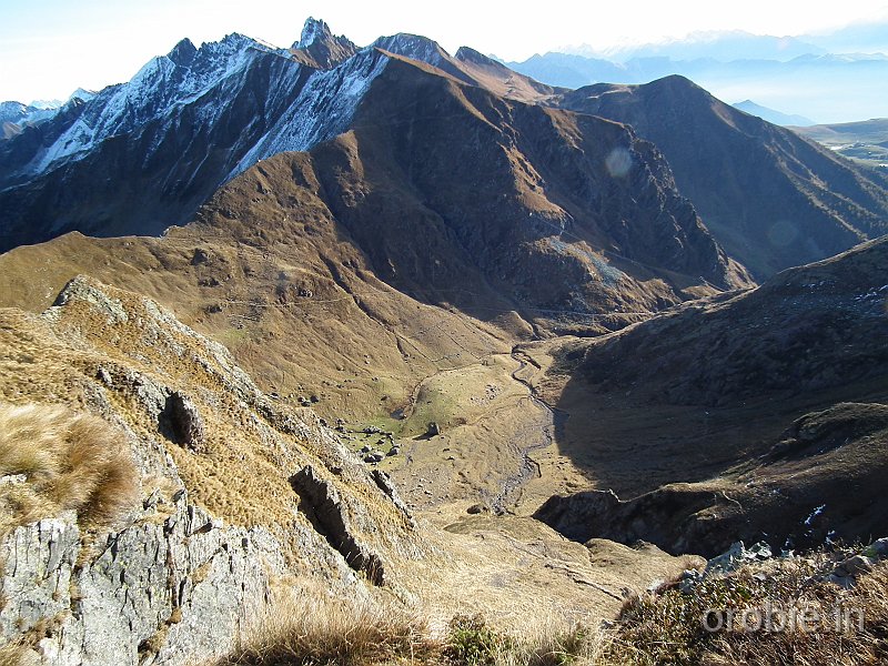 Dal Rif. Grassi (1987 m) si costeggiano i versanti meridionali della Cima di Camisolo e si percorre la panoramica cresta del Pian delle Parole fino a raggiungere la Bocchetta Alta (2235 m). Si prosegue con un sentiero a mezzacosta (Sentiero dei Solivi) attraversando il ripido fianco meridionale del P.zo dei Tre Signori fino a scendere nella Valle d'Inferno dove si incrocia il sentiero 106 a ca. 2030 m. Si risale sul versante opposto fino alla sommità di un canalone e si continua in cresta fino alla Cima di Giarolo (2314 m) per poi scendere alla Bocca di Trona (2224 m). Si oltrepassa la vicina Bocchetta di Piazzotti per giungere velocemente al Rif. Benigni (2222 m).