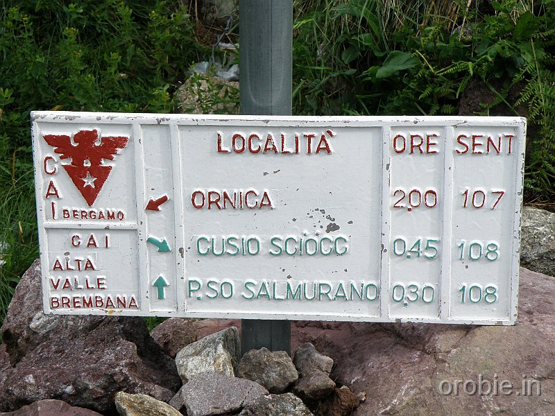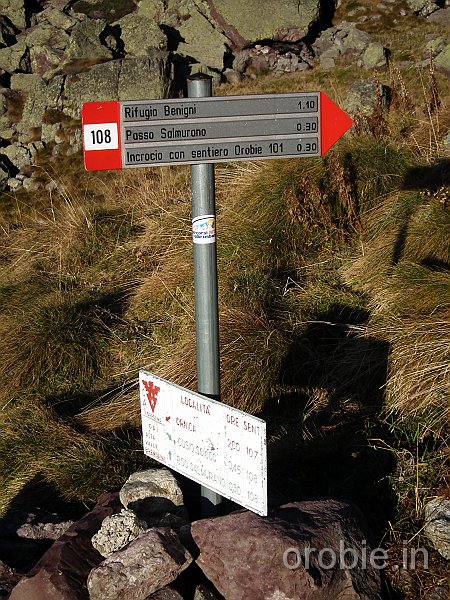 Si prosegue nella salita raggiungendo con alcuni tornanti la conca sotto il passo di Salmurano, e, dopo aver abbandonato sulla sinistra il sentiero 108 che sale al rifugio Benigni, si raggiunge rapidamente il valico (2017 m).