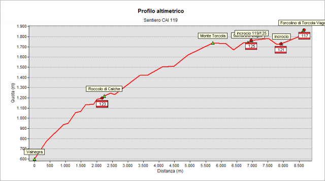 Il sentiero si stacca da via Vena - che corre ca. 50 m a monte della Chiesa di Valnegra (600 m circa) - e sale ripido per il bosco fino al Roccolo di Calche (1225 m circa, incrocio con sentiero 122, sentiero 123 e sentiero 129), posto sotto le pendici del Monte del Sole. Prosegue verso nord-est sempre per boschi e prati, raggiungendo la baita Prato Gervasio (1304 m circa) e, successivamente, la baita Prato Landino (1419 m). In corrispondenza di Prato Landino si giunge a un bivio: seguendo le indicazioni per il 119 si va a destra (il sentiero a sx prosegue invece per il rifugio Rododendro). Salendo nel bosco si giunge poi a sbucare sui vasti prati sommitali, subito alle spalle del Roccolo Rho. Salendo il pendio prativo posto oltre la vicina pozza si attraversa dapprima la Torcola Soliva e quindi la Torcola Vaga, rimanendo sempre sul versante rivolto a Piazzatorre e raggiungendo infine il Forcolino di Torcola (1856 m). Scendendo verso Valleve, il sentiero cambia numerazione diventando il sentiero 117.