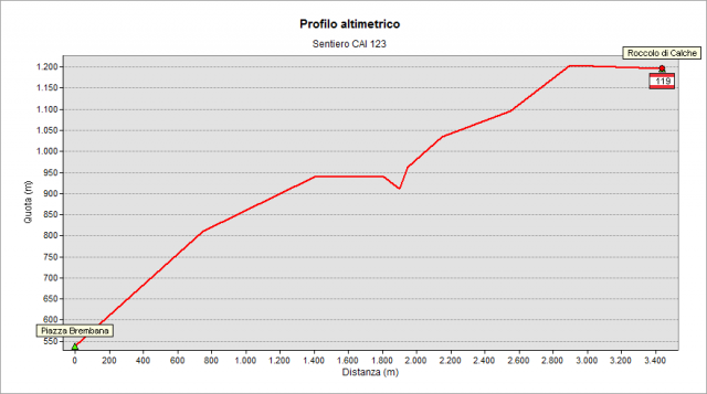 Il sentiero parte da Piazza Brembana, si stacca dalla vecchia via Priula nel centro storico. Dalla piazza principale seguire via F.lli Calvi oppure dall'incrocio tra le vie Belotti e Orenghi (cartelli CAI) salire nel centro storico e, appena passati al di sotto di un bel porticato, imboccare a sinistra la scaletta. Dopo pochi metri, al bivio si tiene la sinistra (a destra si stacca invece il sentiero "del Sole") e si guadagna rapidamente quota per prati e boschi raggiungendo la località Budelivo (771 m). Si continua l'ascesa verso "Il Culmine" (1203 m) e poi, con percorso più dolce, si passa a mezzacosta sotto il Monte del Sole raggiungendo in breve il Roccolo di Calche (quota 1230 m circa) e incrociando il sentiero 119, il sentiero 122 e il sentiero 129.
