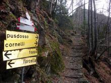 Il sentiero parte dalla strada provinciale della Val Brembana a Fondra (695 m), segue la stradina che sale alle frazioni di Cornelli (946 m) e, di seguito, a Pusdosso (1048 m). Da Pusdosso il sentiero prosegue per un breve tratto in direzione nord e poi gira verso ovest. Attraversati dapprima dei prati e poi un bosco fino a raggiungere la baita Serani, si continua a salire attraverso un bosco ad alto fusto e pareti rocciose, passando vicino alla baita Bagoli, raggiungendo poi l'incrocio con il sentiero 119 in zona Torcola Soliva (1767 m).