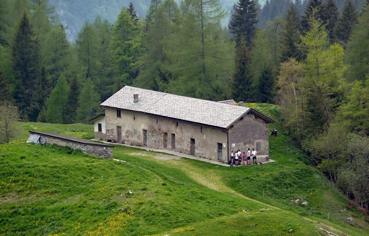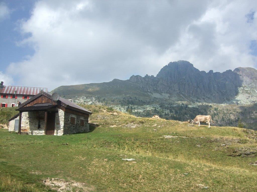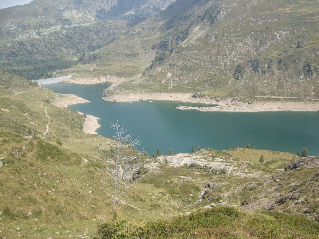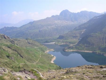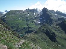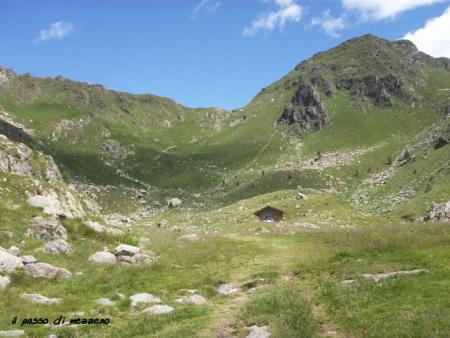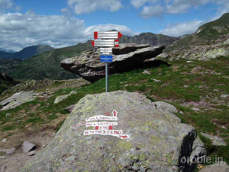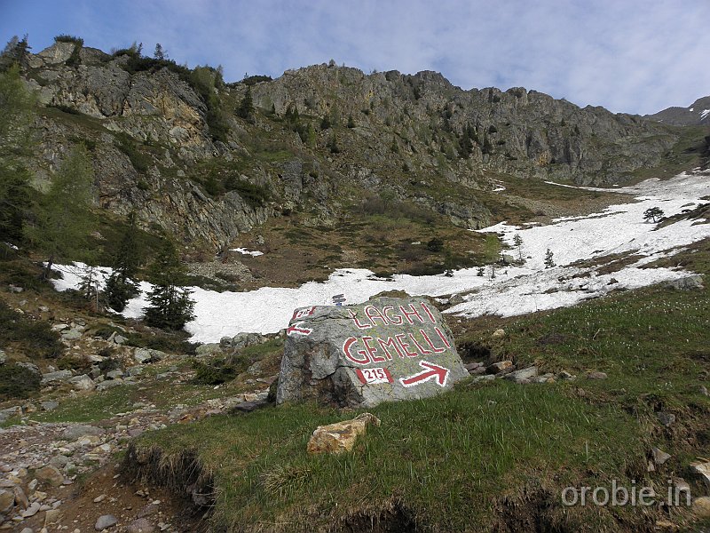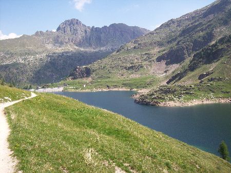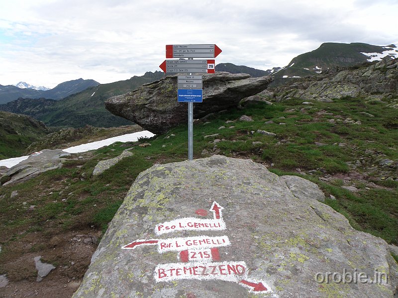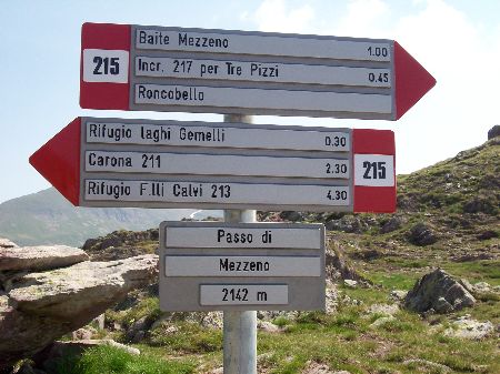 Dal parcheggio presso le baite di Mezzeno si inizia a guadagnare quota sul versante sinistro della valle (orografico destro) lungo il sentiero che porta alle prese dell'acquedotto. Si esce dal rado bosco a quota 1800 m circa e, sulla sinistra, si lascia il sentiero 217 che sale ai Tre Pizzi. Attraversando i pascoli si raggiungono la baita delle Foppe (1933 m) e la baita della Croce. Il sentiero riprende quindi a salire con decisione per guadagnare il ripido pendio che conduce al passo di Mezzeno (2144 m). Dal passo si può godere di un'ottima visuale sui Laghi Gemelli. Si prosegue in discesa fino a raggiungere il sentiero 216 che proviene dal rifugio Alpe Corte e le sponde del lago che si costeggia fino al rifugio dei Laghi Gemelli (1968 m).