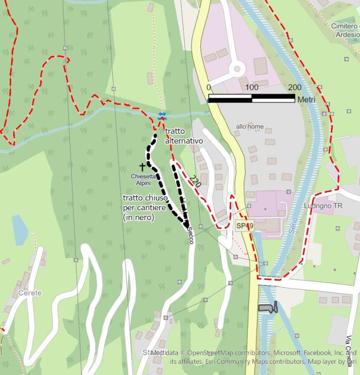 Partendo nei pressi del Municipio di Ardesio (sede della “Pro Loco”, circa 600 metri slm), il sentiero scende verso il fiume Serio e lo attraversa nei pressi della centrale idroelettrica. Poi sale per un tratto - seguendo la strada per le frazioni Cacciamali/Cerrete - fino a raggiungere la strada che porta alla Cappella degli Alpini. Superata la cappella, inizia il tratto più ripido del sentiero: il sentiero sale fino a quota 800 m circa, fino a raggiungere una strada forestale. Ora il sentiero spiana ed entra in Valcanale.
