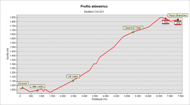 Da Zorzone (1019 m - frazione di Oltre il Colle) si segue la mulattiera che, a mezzacosta in direzione est, conduce in val Vedra. Si risale detta valle con pendenza moderata fino alla località Pian Bracca (1111 m – località da cui si parte ora più frequentemente in quanto raggiungibile con l'auto, sempre da Zorzone). Rimanendo sempre vicini al fondovalle si continua fino alla baita Pessel (1209 m) per raggiungere poi la zona dei pascoli e la casera di Vedro (1672). Sempre in direzione nord, dopo breve salita si è al passo di Val Vedra (1848 m) e, di seguito, al passo Branchino (1821 m, incrocio col sentiero 222 verso la Capanna 2000, col sentiero 218 verso il rifugio Alpe Corte e col sentiero 219 verso le Baite di Mezzeno).