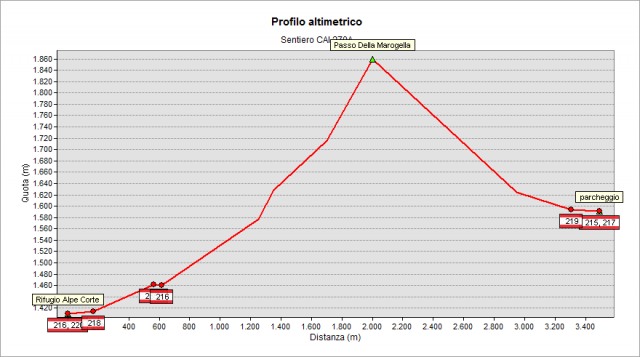 Dal parcheggio (1600 m circa) posto al termine della strada che sale da Roncobello, si prosegue verso le baite di Mezzeno sulla carrareccia e, appena oltrepassato il ponte, si piega a sinistra. Si sale per pascoli fino ad entrare nel vallone che conduce al passo di Marogella (1869 m). Si scende quindi nella Valcanale, entrando dopo poco in un bosco rado fino a incrociare il sentiero 216 nei pressi di un ponte (1460 m circa). Si prosegue sulla destra (sud) e, in breve, si giunge al rifugio Alpe Corte (1415 m).
