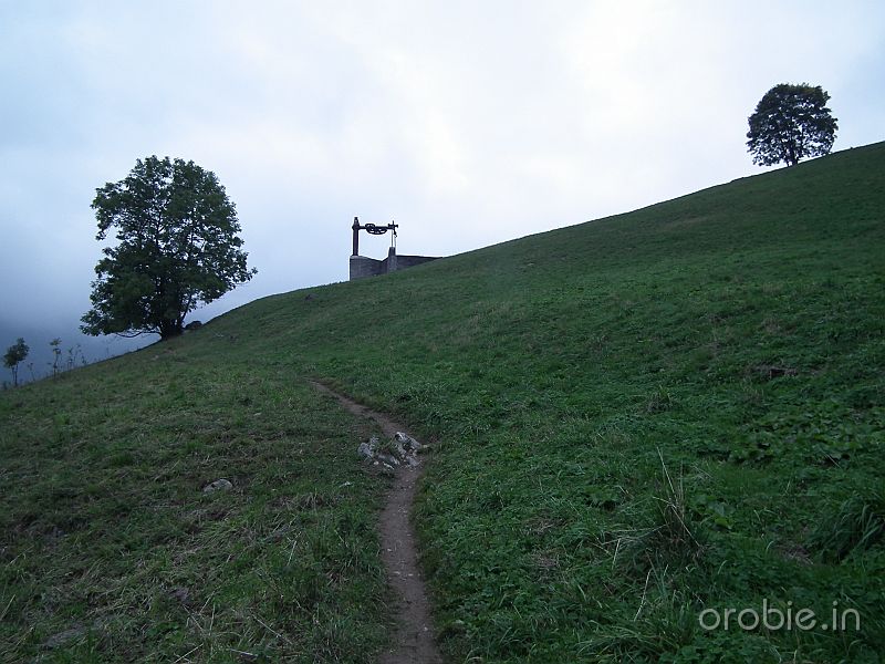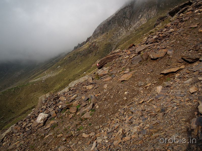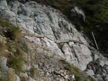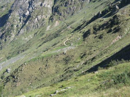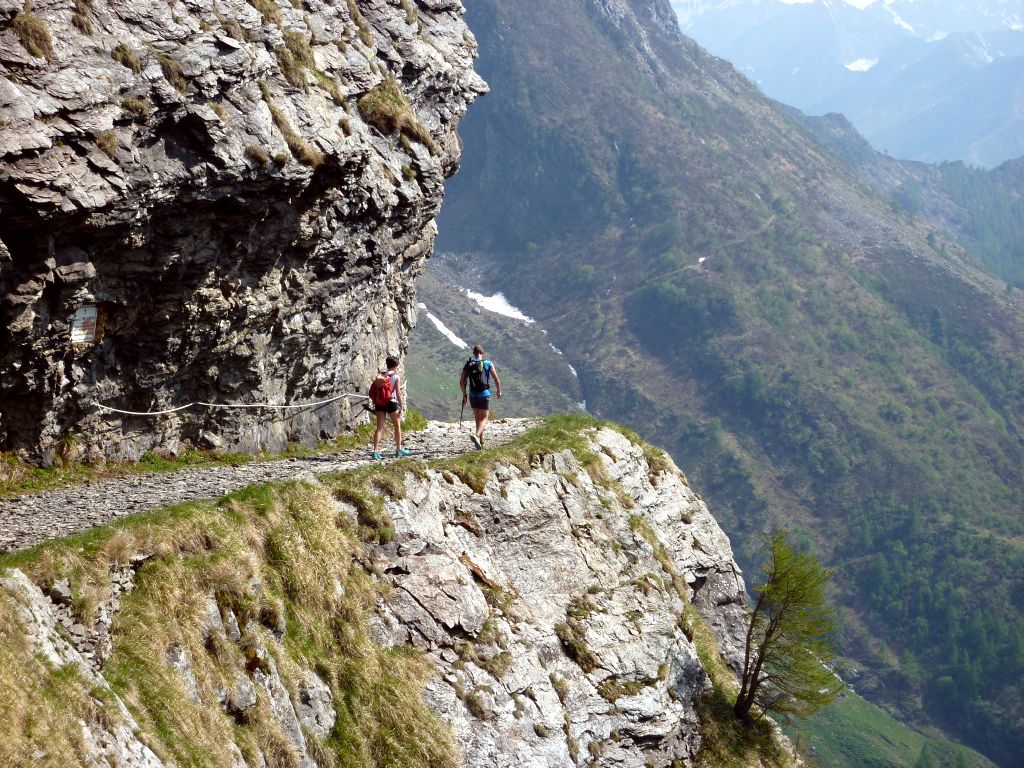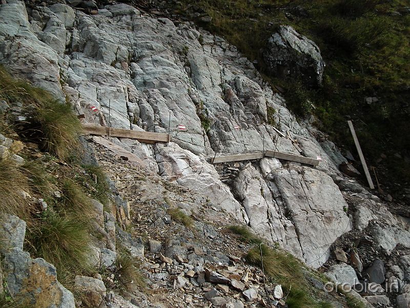 Il sentiero parte dalla chiesa di Lizzola (1250 m circa), sale per pochi metri lungo una stradina per poi attraversare i prati e raggiungere il bosco appena sopra il paese. Si continua ora nella fitta abetaia con salita costante fino a quota 1650 m circa. Oltre si attraversa sempre con percorso a mezzacosta, attraverso ripidi prati e arbusti fino a intercettare il sentiero 304 (a quota 1800 m circa) che proviene dal Passo delle Miniere e che si segue, perdendo leggermente quota e attraversando con prudenza e attenzione alcuni canali ove sono stati realizzati nel 2012 alcuni manufatti per agevolare il cammino, fino a raggiungere il sentiero 305 che sale da Valbondione. Con percorso comune si percorre il tratto panoramico scavato nella roccia e, in breve, si è al rifugio Curò (1915 m).