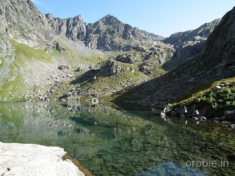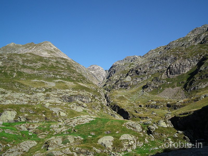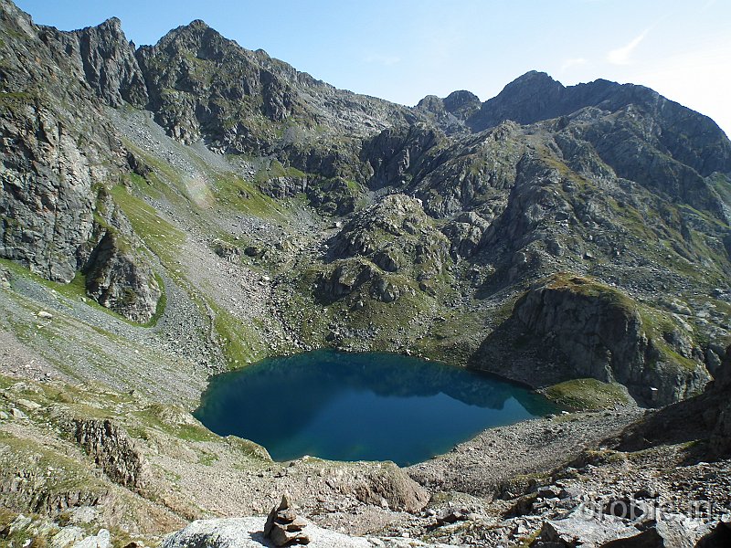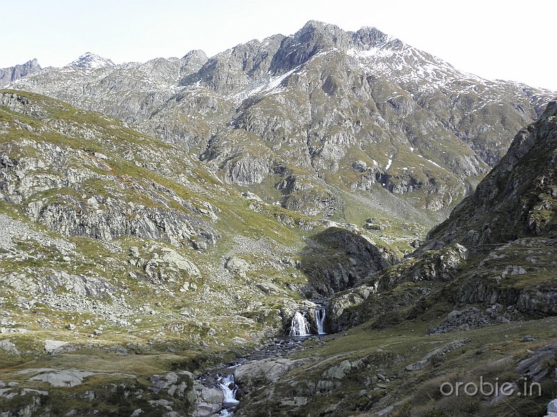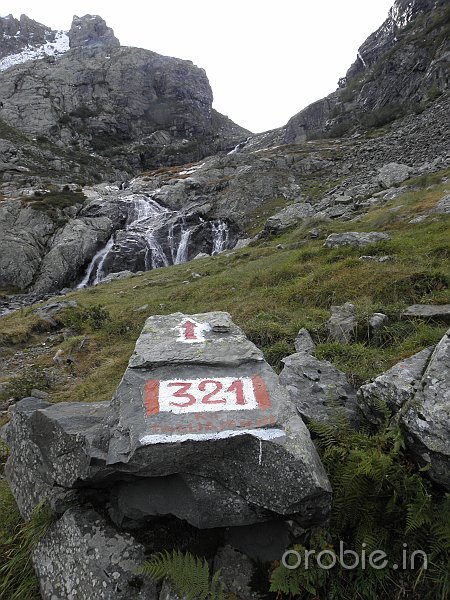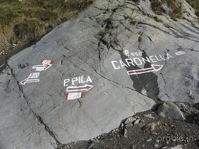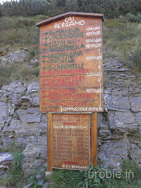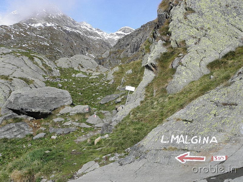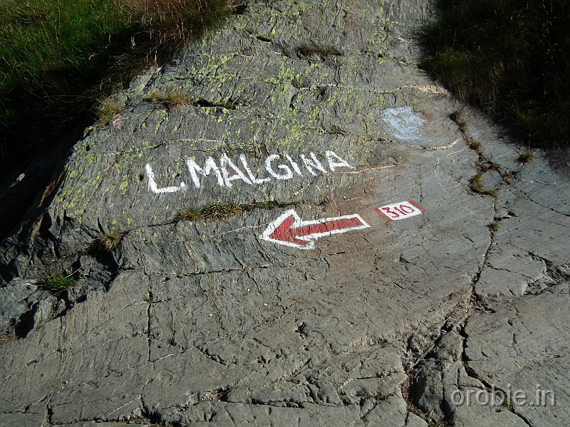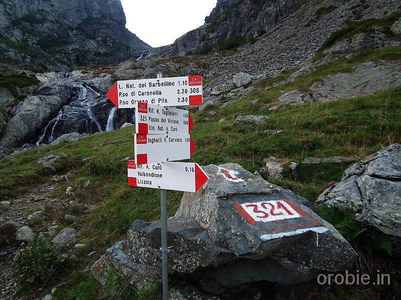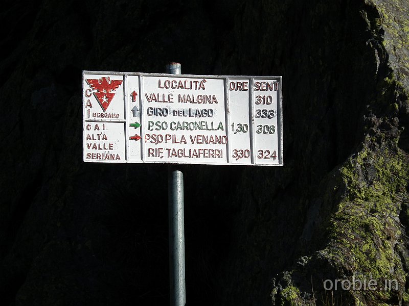 Dal rifugio Curò (1915 m) si costeggia il lago artificiale del Barbellino seguendo la comoda mulattiera che attraversa la Val Cerviera (sentiero 321), la Valle del Trobio e risale la valle del fiume Serio verso il lago naturale. Il sentiero 310 si stacca sulla sinistra a quota 2050 m circa (dopo aver superato un ponte) e risale il vallone che scende dal lago di Malgina, ora sul lato destro, ora sul sinistro, con numerose svolte. Si arriva al lago di Malgina (2340 m), si attraversa nuovamente il torrente emissario e si lascia sulla sinistra il sentiero 335 che sale al passo del Bondone. Si rimonta il versante est sovrastante il lago raggiungendo i piani che ospitano il lago Gelt (2560 m) ed altri numerosi specchi d'acqua senza nome. Sempre procedendo in direzione est si punta a un ripido canalone di sfasciumi e massi che faticosamente si risale con numerose svolte fino alla bocchetta del Gelt (2727 m) e, sempre con svolte, si ridiscende il ripido versante che sovrasta l'ampia sella del passo di Caronella (2612 m).