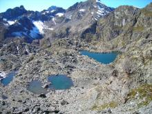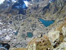 • Tre punti principali del sentiero 310 visti dal Diavolo di Malgina: laghi di Malgina e Gelt.
