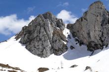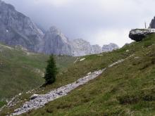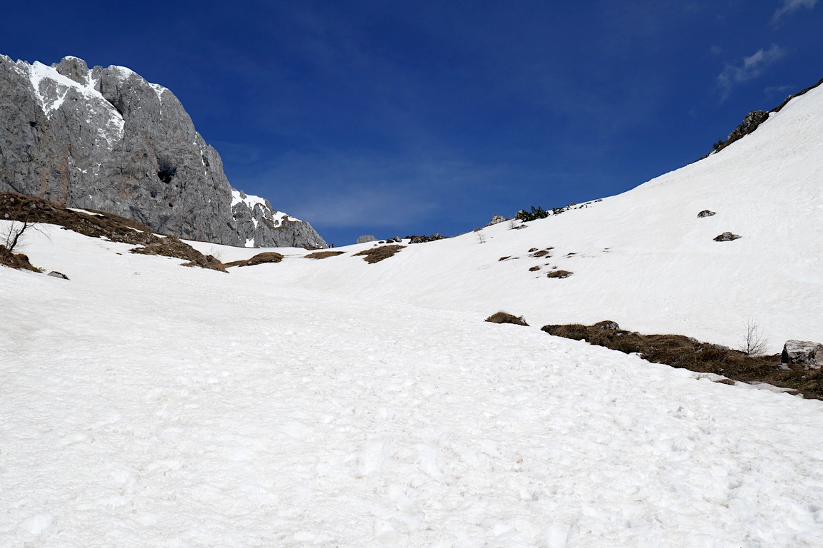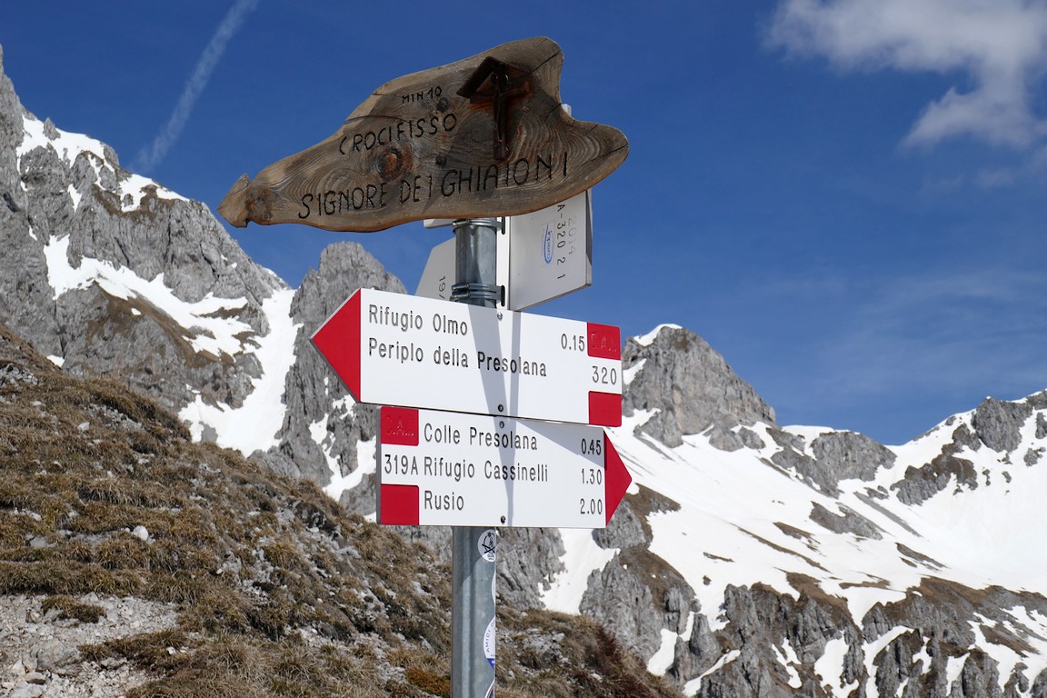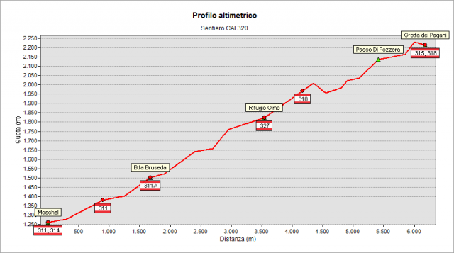 Dalle baite del Möschel (1265 m – raggiungibili da Valzurio in 2 ore) si sale per pochi minuti (15-20') lungo il sentiero 311. Si lascia la strada forestale e si devia poi a destra in direzione di Baita Bruseda (1498 m), quindi si sale nel vallone che porta al rifugio Olmo (1819 m). Oltrepassato il rifugio, il sentiero procede in direzione ENE risalendo dolcemente il largo vallone sino a raggiungere il passo degli Agnelli (1950 m, incrocio col sentiero 318). In seguito si traversa sotto le pareti della Presolana e, con un ultimo ripido strappo, si raggiunge il passo di Pozzera (2126 m). Si prosegue verso la Presolana arrivando in breve alla Grotta dei Pagani (2224 m).