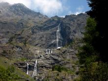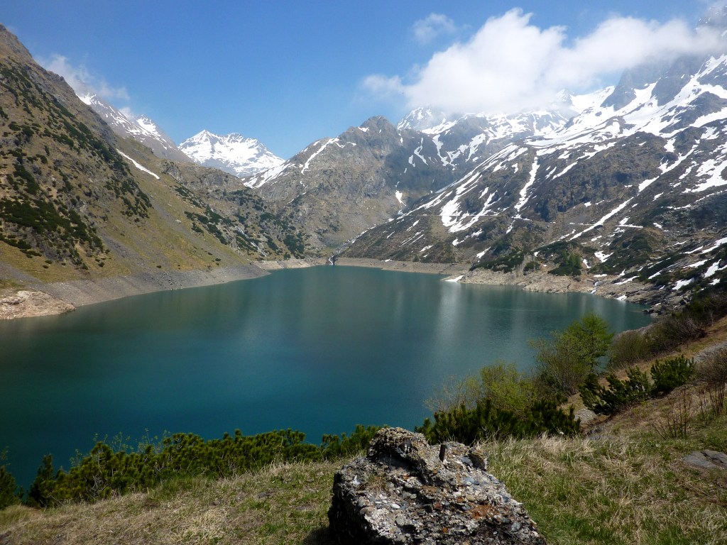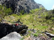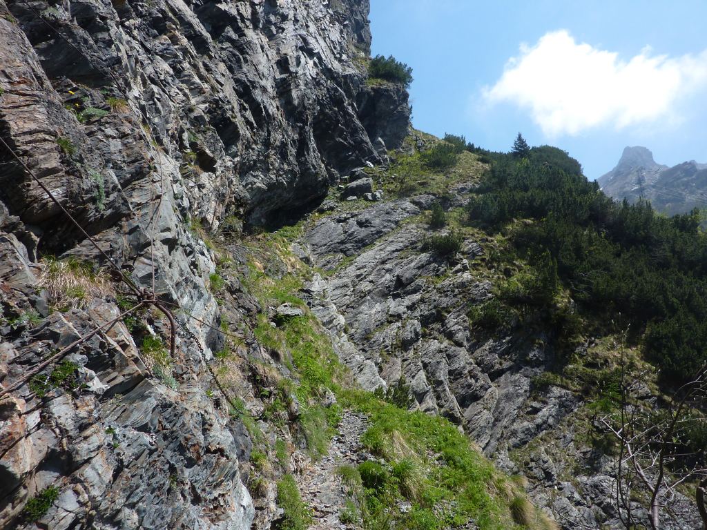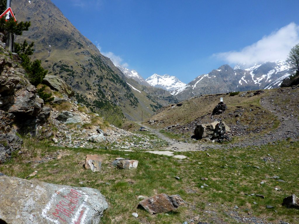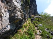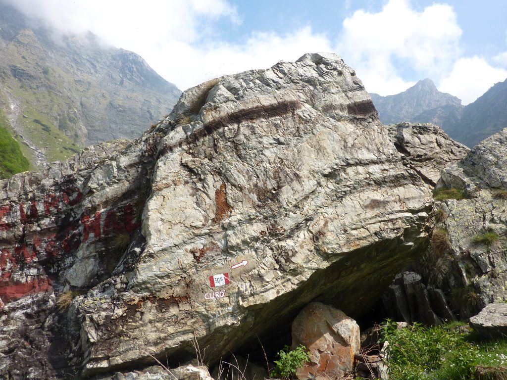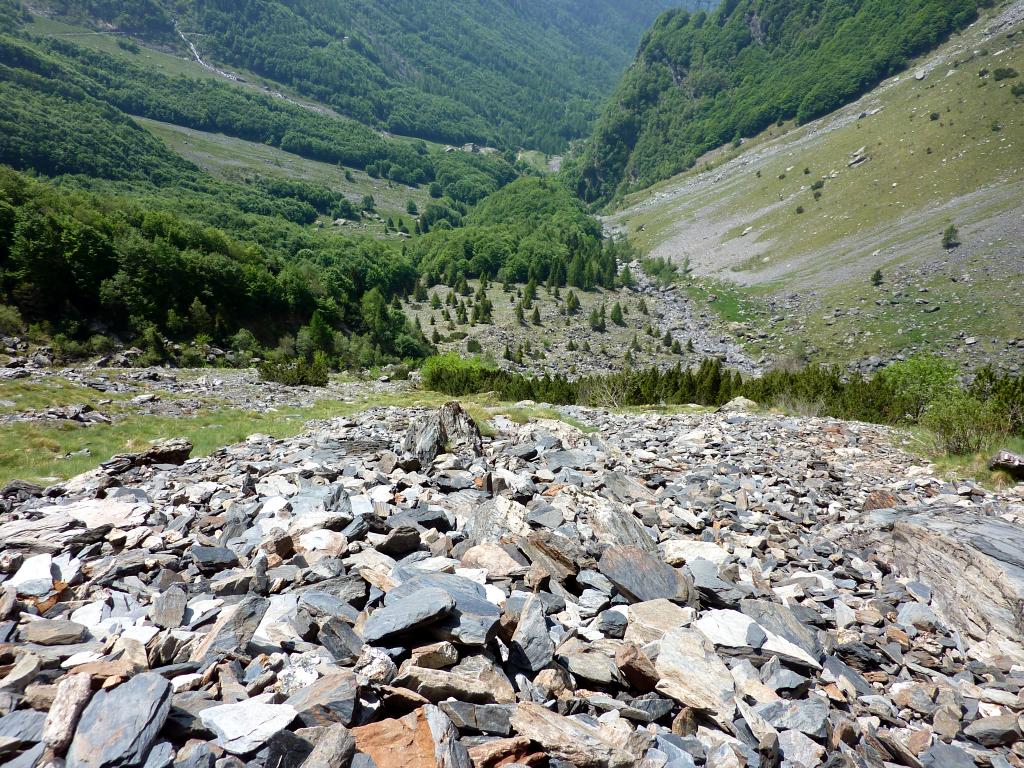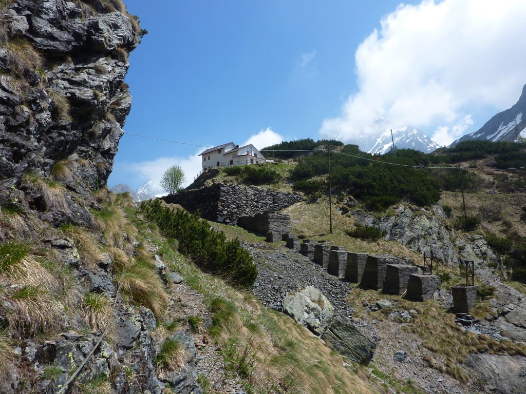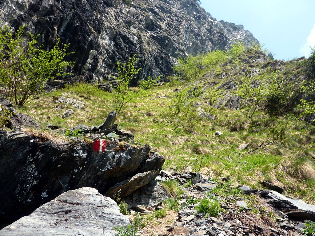 Da Pianlivere (970 m – dopo Valbondione) si attraversa il fiume Serio e si prende a salire nel bosco con alcuni tornanti fino al grazioso nucleo di Maslana (1150 m circa). Superato il primo nucleo di baite si arriva a Piccinella (1192 m), poi si prosegue per attraversare la valle con un ponticello di pietra e passare sul lato orografico sinistro. Si continua prima vicino al fondovalle per poi seguire per un tratto una strada forestale che conduce all'Osservatorio Faunistico del Parco delle Orobie, caratteristica costruzione addossata a un masso ciclopico. Si entra poi in un bel bosco di faggi e si raggiungono i ripidi prati posti sotto la fascia rocciosa che sbarra la valle (fino a qui le difficoltà sono classificate E). Ora, con percorso molto ripido, si guadagna faticosamente quota seguendo la linea di massima pendenza con numerosi zig-zag fino a toccare la citata fascia rocciosa. Se ne attraversa la base verso est continuando la salita (tratto attrezzato con numerosi tratti di catene e cavi metallici, non necessari con terreno asciutto - attenzione a non utilizzarli per la sicurezza o la progressione, non sono stati controllati!) per arrivare al rifugio Consoli U.E.B. e, in breve, al vicino rifugio Antonio Curò (1995 m).