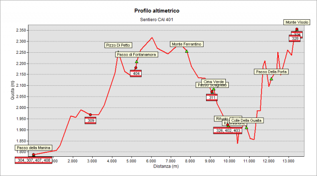 Dal passo della Manina (1821 m) si attraversa a mezzacosta sotto le pendici del monte Pizzul per poi risalire con qualche tornante alla sella dell'Asta (1968 m). Quindi si attraversa il fianco occidentale del M. Barbarossa fino alla conca sotto la parete del Pizzo di Petto. Il sentiero, aggirato uno sperone roccioso, conduce al canalino roccioso posto tra le due cime del Pizzo di Petto, che si risale fino al colletto sommitale (tratto attrezzato difficoltà EE). Si scende leggermente costeggiando le falde meridionali del M. Vigna Vaga fino al passo di Fontanamora (2253 m) e si risalgono i pendii calcarei che scendono dall'omonima cima. Proseguendo si passa sul versante scalvino con una cengia che attraversa la parete est del M. Ferrante e, di seguito, si giunge sui pendii meridionali di detto monte che degradano verso il passo dello Scagnello (2080 m - da qui è possibile scendere sul 311 verso la Valzurio verso Ardesio e chiudere così il sentiero delle Orobie ad anello). Calando per pendii erbosi si è in breve al rifugio Albani (1939 m). Fino al rifugio Albani non è necessario il kit da ferrata.