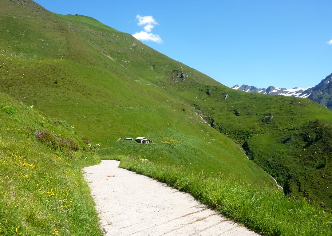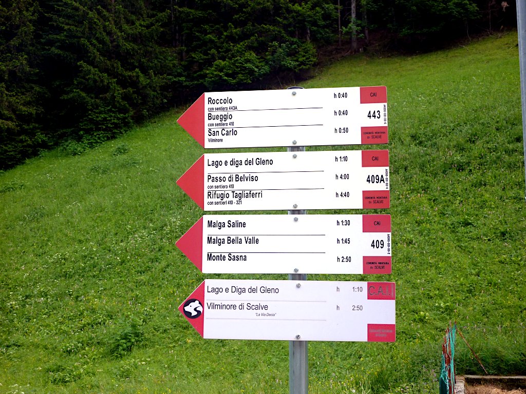 Dalla chiesa si percorre brevemente via Manina, poi si prende la stradina forestale che in breve conduce a Designo (1353 m) (tratto in comune con il sentiero 409A e la via Decia) e, dopo un breve tratto in piano, si inizia a salire con decisione raggiungendo le baite Esenne (1555 m). Si continua con pendenza più moderata fino alle baite Saline (1770 m) e, più oltre, sino al bivio per la vicina baita Bellavalle (1795 m). Senza raggiungerla, si continua invece l'ascesa arrivando alla pozza a quota 2063 m e poi al colletto (passo del Sasna, 2139 m) che si affaccia sulla valle Bondione e, seguendo la cresta a sx, al M. Sasna (2229 m). E' pure possibile, ca. 100 m prima del passo, prendere il largo sentiero sulla sx che pure conduce in vetta.