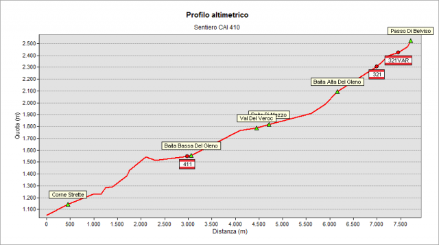 Il sentiero sale alla sinistra (destra orografica) del torrente Gleno fino al lago e ai ruderi della diga del Gleno (1534 m), crollata il 1º dicembre del 1923. Si contorna la sponda del lago e, in fondo al pianoro erboso, si raggiunge la baita bassa del Gleno; si continua lungo la valle e si raggiunge un secondo pianoro erboso, lo si percorre tutto e in fondo, a quota 1818 m, si trova la baita di mezzo del Gleno (1818 m). Si attraversa poi il torrente per giungere ai ruderi del rifugio Bissolati (crollato sotto la neve nella primavera del 1925) a 1950 m di quota. Da qui si sale con maggiore pendenza, fino a raggiungere la baita alta del Gleno (2091 m) e a incrociare il sentiero 321. Con un ultimo strappo si arriva infine al passo di Belviso (2518 m).