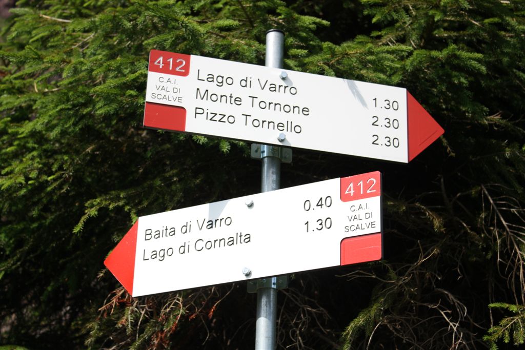 Poco sopra Vilmaggiore i due sentieri si uniscono in unico sentiero che sale nella valle del Tino. Proseguendo si arriva alla località Cascinetti (1719 m) e, poco oltre, si presenta un bivio. Tenendo la sinistra si sale al lago di Cornalta (2181 m), tenendo la destra si sale invece al lago di Varro (2236 m). Presso quest'ultimo lago, i due suddetti sentieri si riuniscono nuovamente. Si prosegue puntando alla sella (2509 m) posta tra il M. Tornone e il Pizzo Tornello (lì si incrocerà il sentiero 430, che conduce al rifugio Tagliaferri). Da tale sella, seguendo poi la costa pietrosa verso nord, si giunge in breve sul Pizzo Tornello (2687 m).