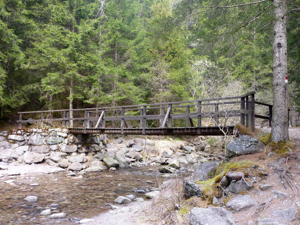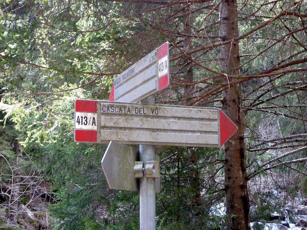 La stradina forestale conduce al ponte in legno ch scavalca il torrente che scende dalla valle del Venerocolino. Si inizia a risalire la valle del Vò, attraversando il bel bosco mantenendosi sulla sinistra orografica della valle. Dopo circa 30', 413A si biforca (bivio segnalato): voltando a sinistra si percorre un ponte in legno che permette di attraversare il torrente Vò e quindi si incrocia il soprastante sentiero 413. Proseguendo diritti alla biforcazione si giunge rapidamente al cospetto della bella Cascata del Vò. (2 minuti)