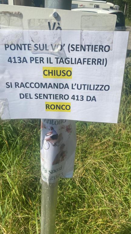 Il sentiero inizia 100 m oltre la località La Paghera (1100 m) sulla sinistra orografica del Vò. distaccandosi - sulla sx - dal sentiero 414 che inizia dal ponte stradale sul Vò.