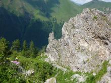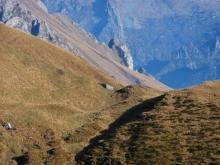 Il sentiero segue il canale per poche decine di metri (vi sono vecchi cavi metallici ma in buona parte disancorati) per poi attraversarlo; dopodichè si procede con pendenze più tranquille sino a giungere al solitario Passo di Lifretto (1997 m).