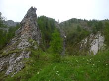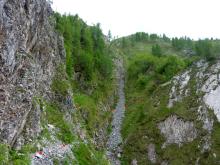 Si sale nel bosco sino ad uscirne e ad affacciarsi nella vasta conca posta sotto il M. di Vai Piane. Seguendo la segnaletica si costeggia il bosco quindi si sale per un ripido costone al termine del quale si giunge alle pareti rocciose che delimitano il canale denominato Glera.