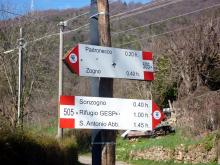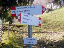 Il tracciato segue l'antica mulattiera che collegava il paese con la contrada Pernice. Risaliamo la mulattiera in direzione NE e, dopo circa 15', superiamo una santella in località Cornelle. Poco più avanti, in prossimità della strada asfaltata, si può godere di una bella vista sul fiume Brembo. Ancora 5' di cammino e raggiungiamo la contrada Padronecco; su questo “balcone verde” regna la quiete e sembra che tutto ciò che c'è attorno prenda le distanze dal caos di fondovalle. E' questa la patria di Don Giovanni Antonio Rubbi, conosciuto con l’appellativo “Preòst Sant”; sulla facciata della casa natia è stata posata una targa commemorativa che ricorda questo illustre personaggio storico. A quota 700 m, la contrada Pernice con i suoi angoli pittoreschi. Il tratto di percorso che segue non ha più le caratteristiche della mulattiera bensì quelle di un sentiero. Superato un fabbricato rurale si giunge ad un bivio: a destra il sentiero porta sulla linea tagliafuoco, a sinistra i segnavia di colori bianco-rosso ci indicano la via da percorrere. Il sentiero si addentra poi in una zona ancora selvaggia, denominata “La Mughera”. In alcuni punti si apre un vasto panorama sulla conca di Zogno. Dopo aver camminato per circa un'ora e mezza, si vedono spuntare nei prati le case del borgo Sonzogno (Sum Zogno): da questo toponimo l'origine del cognome Sonzogni tanto diffuso nel Comune. Si svolta nel pascolo in direzione NE, percorrendo poi un tratto di sentiero rilassante in un bosco di faggi per giungere al Rifugio Monte Zucco (G.E.S.P.). in località Foppi. Da qui la possibilità di salire al M. Zucco prima di proseguire sul sentiero più battuto che conduce verso S. Antonio Abbandonato. Dalla piccola frazione si ha poi la possibilità di ritornare a Zogno seguendo il sentiero 505A oppure il sentiero 505B.