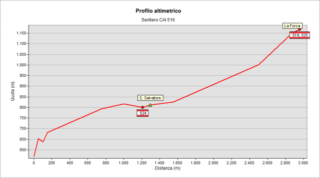 Il sentiero parte da Vertova percorrendo il primo tratto del sentiero 527. Poco oltre la spettacolare cascata della Val de Gru si guada il torrente Vertova: da lì in poi il sentiero sale velocemente fra le rocce, facendosi meno ripido in prossimità della stalla del Corno. In breve si giunge poi al guado del torrente Gru e ci si innesta sulla carrareccia che porta alla chiesetta di S. Salvatore (XVII sec.). All'incrocio con il sentiero 524 si segue la strada a sinistra che, poco dopo, diventa sentiero fino alla Forca d'Aviatico (1160 m). Da qui si prosegue fino al Monte Poieto (1360 m). Dal 2021 il sentiero 516 è stato prolungato dalla Forca d'Aviatico fino al M. Poieto