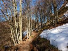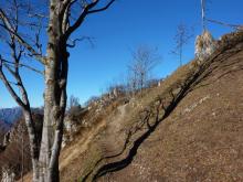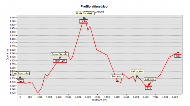 Il sentiero dal 2021 viene ora fatto partire da Aviatico (1010 m) e non più dalla Forca d’Aviatico (1159 m). In prossimità del municipio (parcheggi) si imbocca la scalinata che sale verso la chiesa. Si prosegue sempre su v. Coletti attraversando il nucleo abitato per poi sbucare su via Monte Alben che si segue fino ad arrivare alla Forca d’Aviatico. Il tracciato prosegue in piano nel bosco, passando sotto il roccolo Picinali e, dirigendosi sempre verso nord, giunge in breve a Cà Donadoni. Al bivio (cartello indicatore) si gira a sinistra; il sentiero prosegue in salita, giunge al Forcellino (1205 m) dopo ulteriori 25' e sale lungo la cresta senza alcuna difficoltà, sbucando poi a un colletto (incrocio con sentiero 524 e sentiero 519C) dove a sinistra sorge la stalla del Suchello/b.ta Val di Mafè. Prosegue ora per cresta erbosa fino a raggiungere l’anticima del monte, poi scende a un secondo colletto e, seguendo la cresta a tratti rocciosa, raggiunge la vetta del M. Suchello (1541 m) da dove si gode un bellissimo panorama sulla selvaggia val Vertova e sulla val Seriana. La discesa (verso nord) trova subito il rifugio G.A.M. al Suchello e l'incrocio col sentiero 519A, quindi procede - scoscesa ma senza troppe difficoltà - sino a raggiungere in breve il passo di Barbata, con il suo stupendo roccolo omonimo. Qui incrocia il sentiero 525 (proveniente da Cà de Spì e diretto all’Alben) e il sentiero 519B (che scende sul lato brembano, diretto a Costa di Serina). Dal passo, il 519 prosegue in direzione nord-est per giungere, in meno di un'ora, alla Conca di Sedernello - amena e austera al contempo - dove si innesta sul sentiero 527 (che, proveniente dalla val Vertova, sale al bivacco Testa).