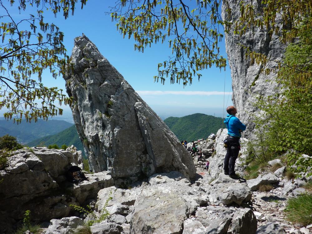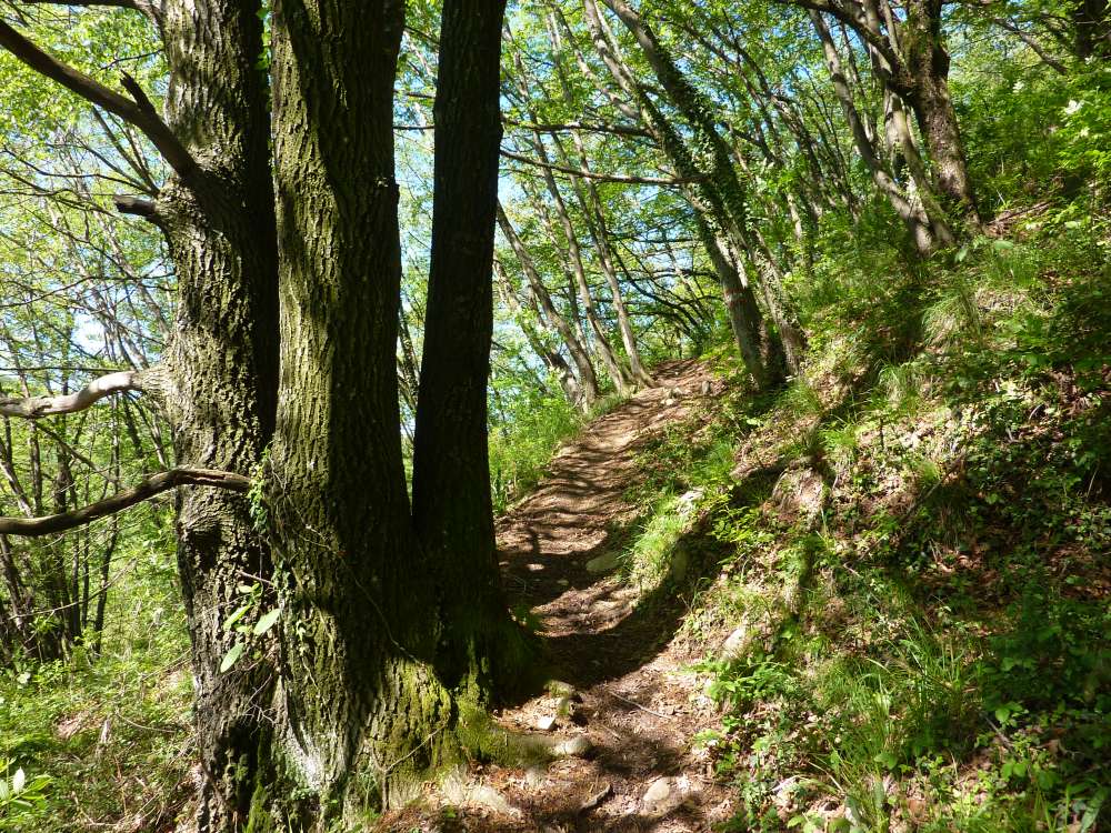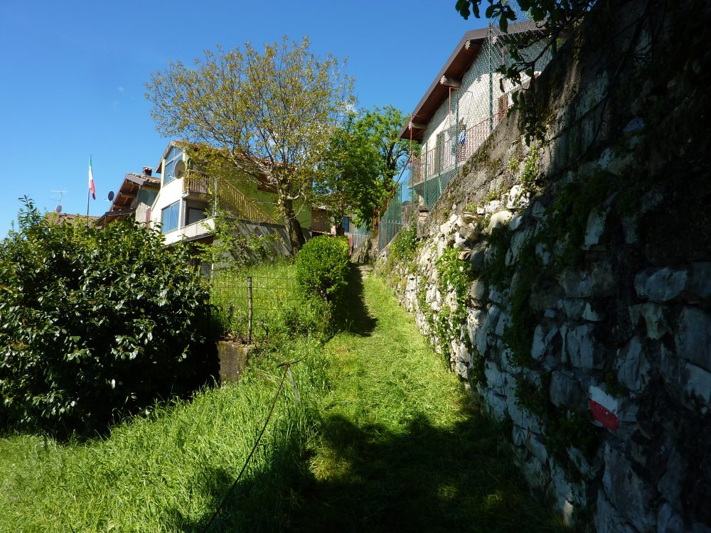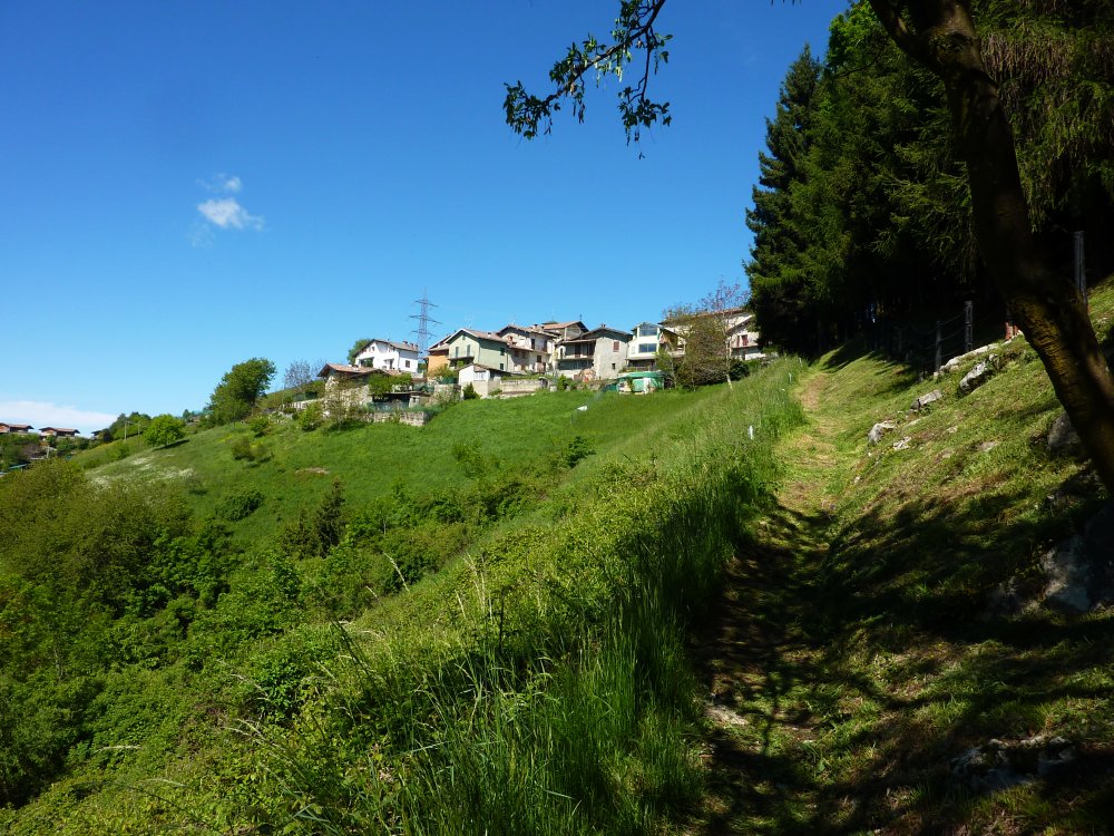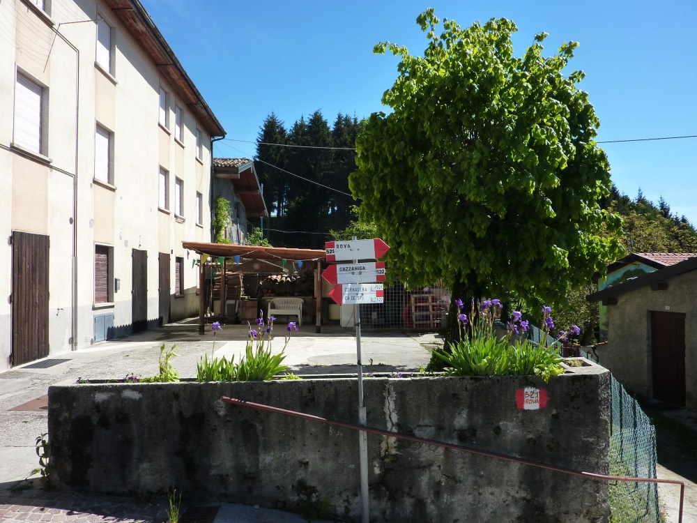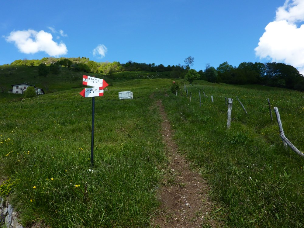 Il tracciato inizia lungo la strada a destra della chiesetta in piazza S. Mauro a Rova, in comune di Gazzaniga, attraversa la parte alta della frazione e percorre i prati soprastanti. Raggiunto il bosco, sale zigzagando lungo la valle Squadrù, quindi piega a sinistra e sale alla località Cuca; proseguendo a destra, raggiunge la baita Pradelada. Da qui il tracciato sale dapprima piuttosto ripido sulla costa del monte Ganda, poi piega nuovamente a sinistra e, con leggera pendenza, raggiunge l’abitato di Ganda (1060 m) nella piazzetta della chiesa, dove confluiscono anche il sentiero 522, il sentiero 520 e il sentiero 538. La chiesa è del XVII secolo e conserva affreschi del pittore vertovese G. B. Paganessi. Seguendo l’apposita segnaletica si giunge alla località Murena (dove si affianca per un breve tratto al sentiero 522); da qui il sentiero sale verso il M. Poieto, costeggiando l'Osservatorio Astronomico delle Prealpi Orobiche. Si giunge poi a un bivio, dove il 521 si stacca a sx dal 522 e, in breve, si arriva in vista dei torrioni della Cornagera, rinomata palestra di arrampicata utilizzata come tale da circa un secolo. Si svolta poi a destra e si raggiunge un vallone assai suggestivo denominato Labirinto: lo si percorre, si gira a sinistra e, salendo lungo facili roccette, si arriva presto in vetta alla Cornagera (1311 m).