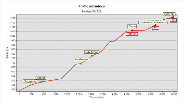 Dalla chiesa di Ganda ci si sovrappone per un tratto al sentiero 521 e si segue la strada asfaltata verso l'Osservatorio Astronomico delle Prealpi Orobiche. Qui si ricomincia a salire e la strada diventa sterrata, si arriva ad un bivio con la biforcazione tra Monte Poieto e Cà de Spì. Si segue quest'ultima indicazione girando verso destra e il sentiero diventa pianeggiante sino a destinazione. A Cà de Spì si incrociano il sentiero 523 e il sentiero 525.