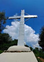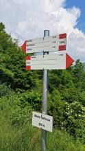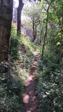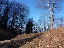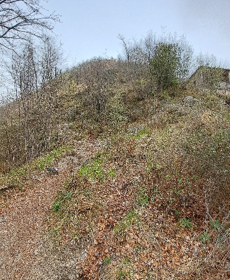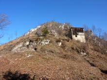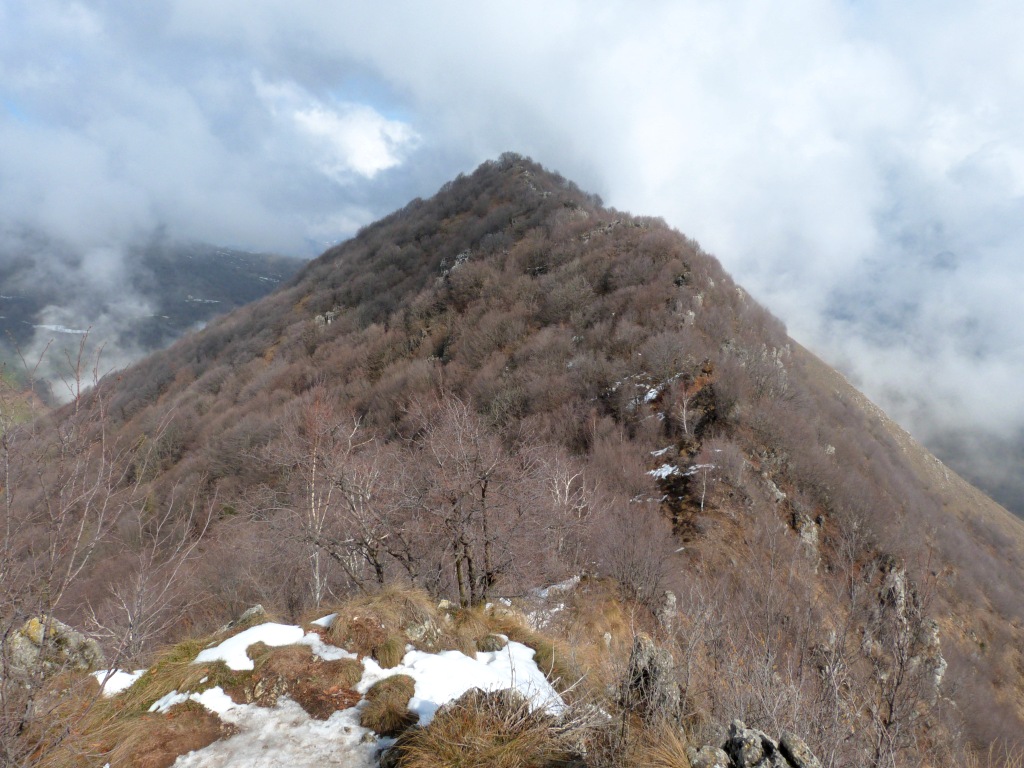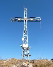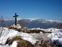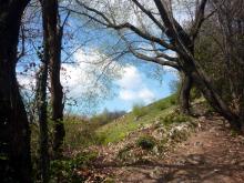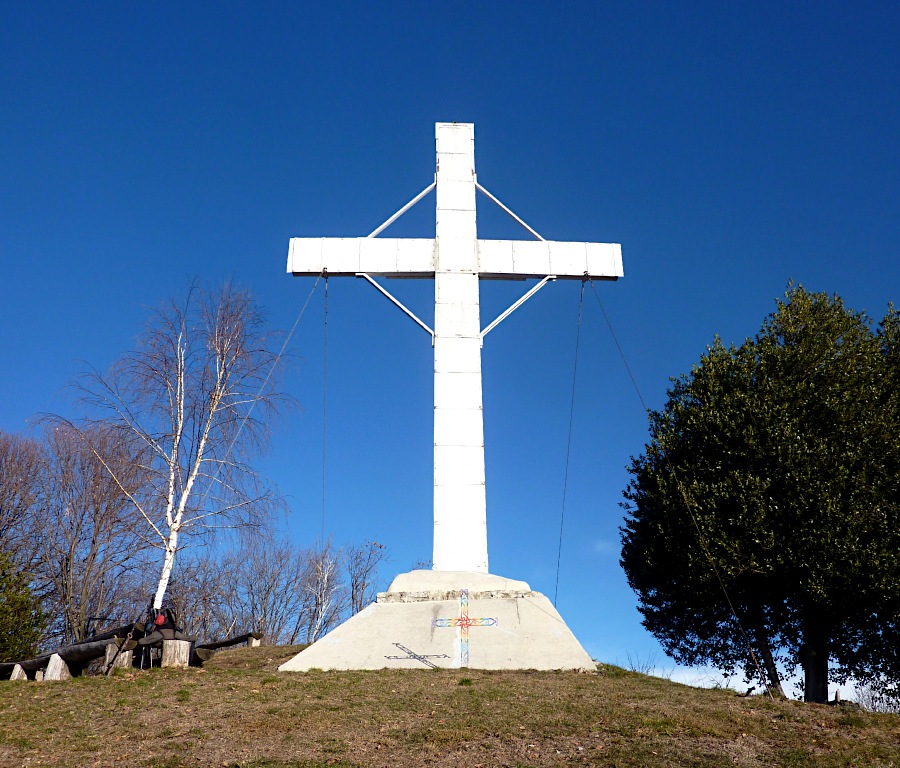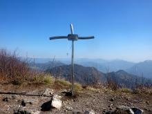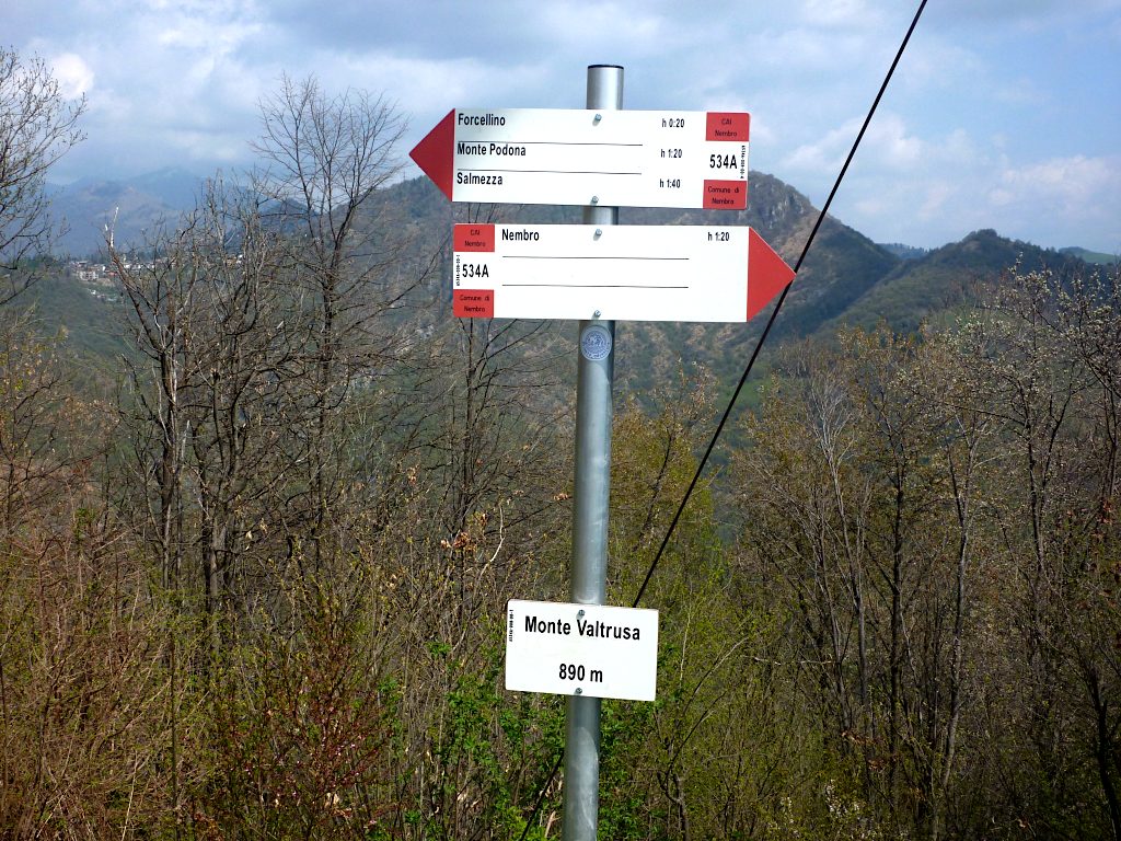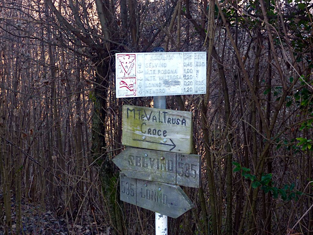 La si attraversa per poi spostarsi a sinistra fino a trovare alcuni gradini che permettono di superare la scarpata. Si continua in salita ripida per raggiungere la croce del M. Valtrusa (890 m).