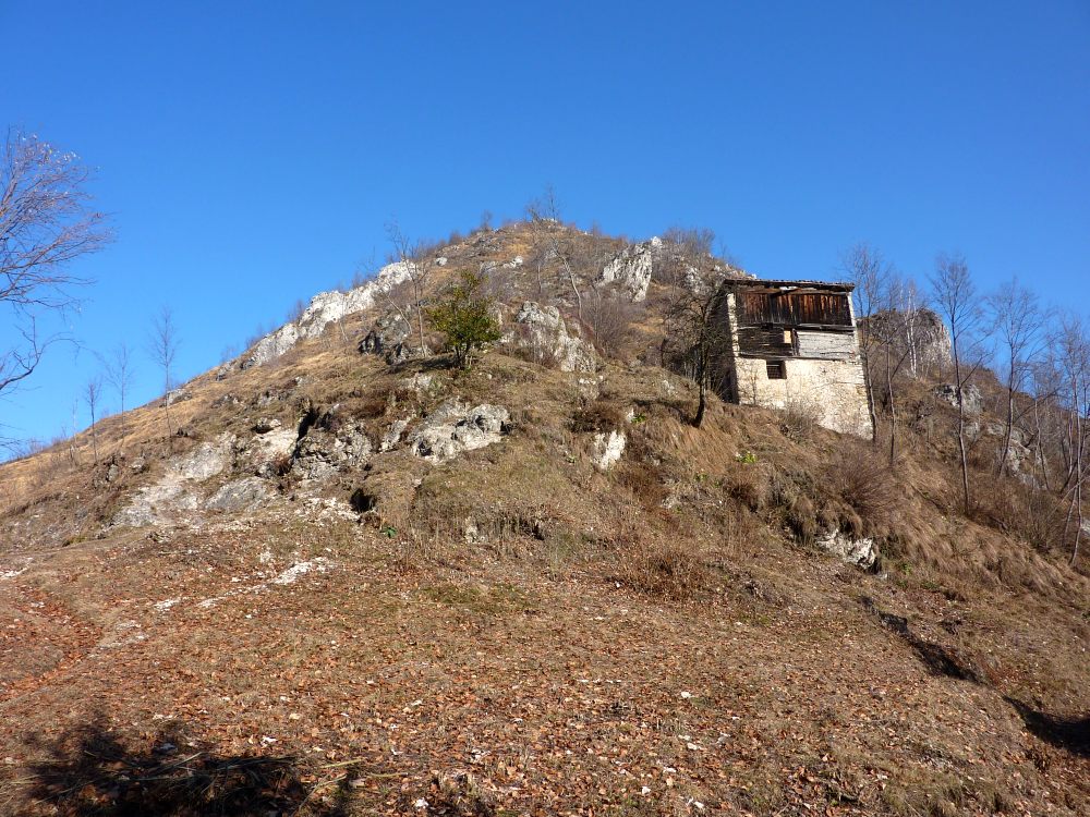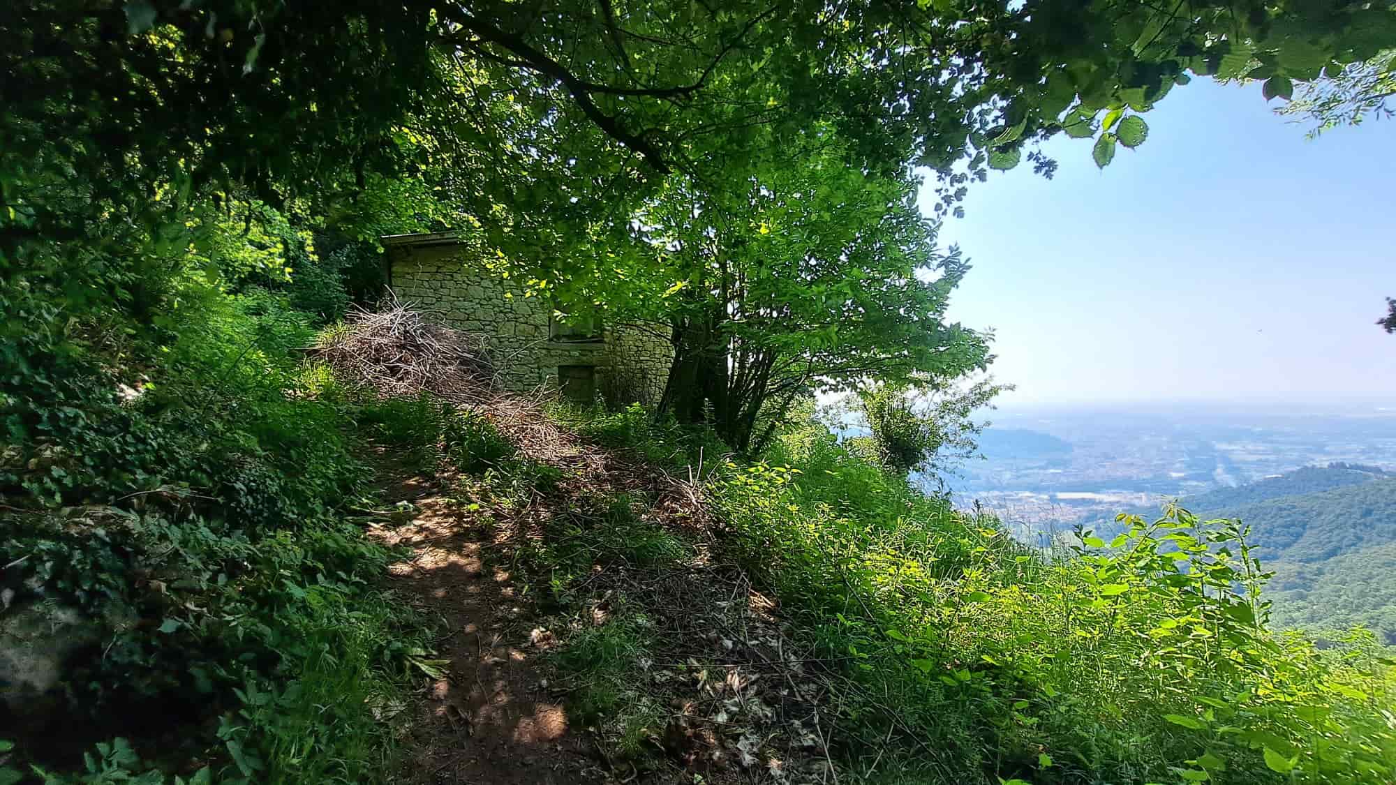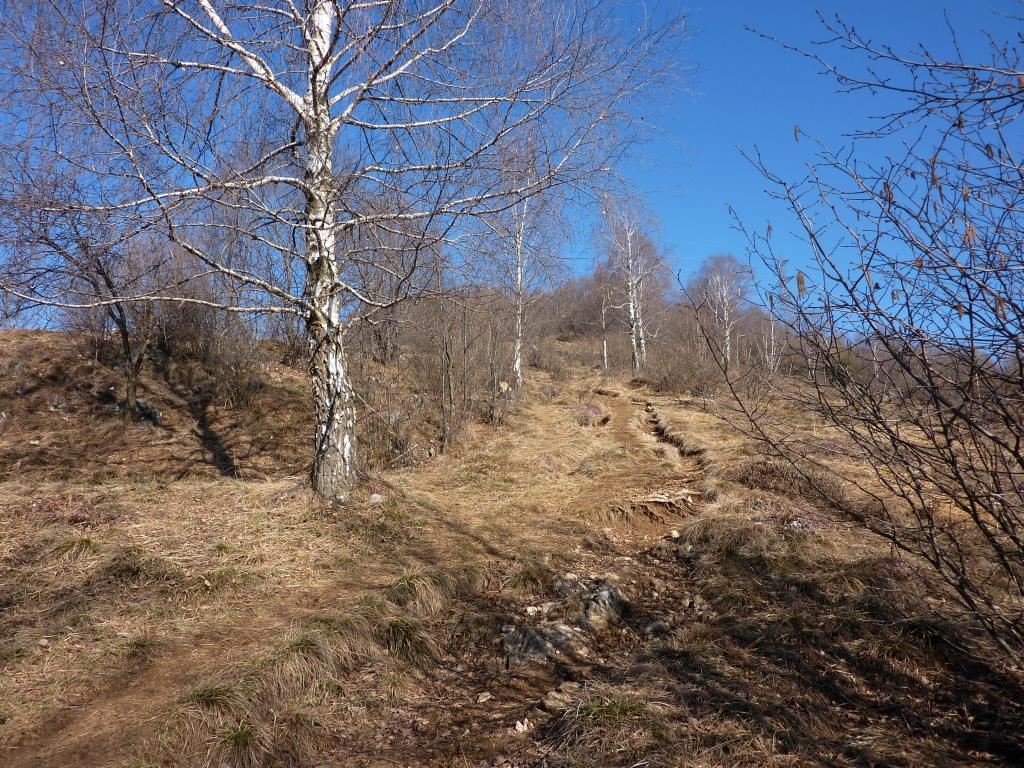 Il sentiero prosegue comodo verso nord scendendo fino a un roccolo per poi tornare pianeggiante e superare delle piccole creste rocciose fino alla torre di un secondo roccolo e un capanno.