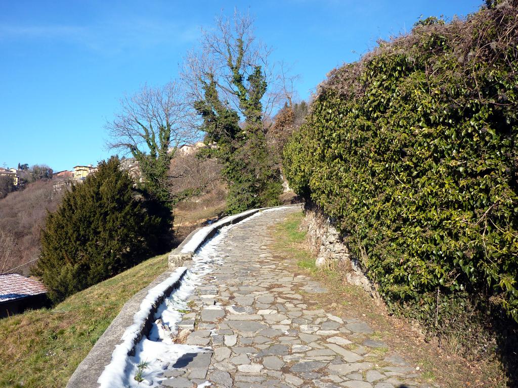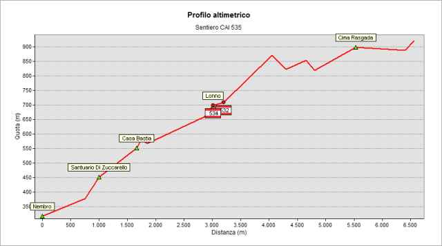 Da Nembro si seguono i cartelli stradali che dirigono al santuario della Madonna dello Zuccarello. Qui c'è un grande parcheggio dove si può lasciare l'auto. Dal sagrato est del santuario (XVI secolo) si gode un magnifico panorama sulla bassa Valle Seriana. L'itinerario riprende salendo lungo l'antica mulattiera per Lonno, ora completamente ripavimentata, che si inoltra nel bosco di latifoglie, raggiungendo in breve il colle Bastia. Dopo una fontanella sulla destra il sentiero è ora pianeggiante e fiancheggia il "percorso vita". Dopo due vallette e una fontanella ad arco, il sentiero giunge alle prime case di Lonno indi in piazza Buonarroti, dove incrocia il sentiero 532 e il sentiero 534. Dopo una strettoia ed una scalinata, si porta ripido fra muretti fino a quota 750 m e, dopo una brusca svolta a sinistra, il percorso diviene pianeggiante nel bosco con brevi tratti in salita fino al Forcellino (861 m). Da qui il sentiero prosegue, percorrendo le pendici orientali del Monte Podona e, dopo aver oltrepassato la sorgente della Corna Tagliata, giunge in un vallone boscoso. Il tracciato svolta bruscamente a destra terminando in una cava di pietrisco, che si attraversa per immettersi sulla strada provinciale di Nembro - Selvino, in prossimità dell'abitato.
