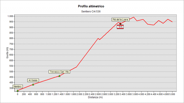 Il sentiero si può imboccare in località Gioldo oppure in località Trevasco (Nembro), all’altezza della bella chiesetta del XV secolo che conserva una pala di Palma il Giovane (il tracciato è accessibile a tutti, pur essendo la parte iniziale, fino alla località Palazzo, abbastanza ripida). Si sale poi al panoramico “Pià ‘lla Löera” (944 m), dove si incrocia il sentiero 515. Poi ci si sposta sul versante orientale, dominando la sottostante Valle dell’Albina, quindi si prosegue a mezzacosta attraverso boschi radi e pascoli, per giungere nell’abitato di Selvino in via Fiume Serio.