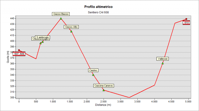 La partenza è segnata nello stesso punto del sentiero 607 (390 m). Prosegue scendendo verso sud mantenendosi a fianco della strada comunale in direzione di Canton, fino a raggiungere la località Muratello (311 m). Subito dopo l'abitato il tracciato gira bruscamente a sinistra, passa a fianco di Corna Caneva e risale la valle mantenendosi alla sinistra della strada comunale che serve le varie costruzioni disseminate sul percorso. In località Vallesse (386 m) il sentiero svolta a destra ed in breve termina alla chiesa della Madonna del Mirabile (XVIII sec., 450 m) dove incrocia il sentiero 610.