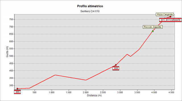 La partenza è situata nel centro paese di Trescore Balneario. Dopo aver parcheggiato in via Mazzini, dove peraltro vi è la sede C.A.I., si continua lungo la via Mazzini e si esce dal paese. Il sentiero, affiancato da una strada comunale, si dirige verso Nord e in breve raggiunge la località Roccolo dove, tra vigneti e pascoli, sorge il santuario della Madonna del Roccolo. Prosegue sempre in direzione nord affiancato sulla destra dalla strada comunale e, dopo un paio di Km., raggiunge la chiesa della Madonna del Mirabile, versante Nord del Monte Sasser (488 m). Il tracciato a questo punto gira verso destra e, dopo alcuni tornanti, raggiunge il Roccolo Zappella ( 674 m). Dopo un tratto di salita si trova l'innesto con il sentiero 611, in zona Pizzo Casgnola (792 m).