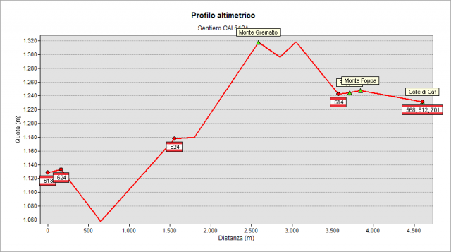 Il percorso inizia al Colle di Caf (1242 m) raggiungibile tramite il sentiero 612, il sentiero 568 o il sentiero 701 (oppure direttamente in auto - ma con possibilità di parcheggio molto limitate - dai vicini Colli di S. Fermo). Giunge quindi alla località Foppelle (1230 m) alla cui sinistra si erge il modesto rilievo del M. Foppa (1265 m). Poco dopo, nei pressi di una pozza, inizia una leggera salita e si vanno a raggiungere le due vette del M. Gremalto (1323 m), per poi scendere verso la stalla Solivo di Valpiana (1167 m). Si prosegue quindi per andare ad aggirare a settentrione il M. Ballerino e poi immettersi nel sentiero 613 a 1110 m di quota.