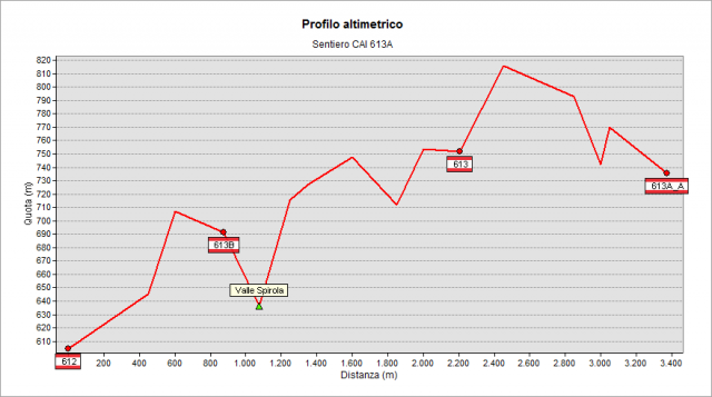 Il percorso inizia in zona Corna Cummia (720 m) staccandosi dal sentiero 613. Sale nel bosco per circa 700-800 m e ritorna ad incrociare il sentiero 613 in zona Murlansì (il nome è dovuto all'impressionante costruzione di un muro a secco). Per alcune decine di metri i due sentieri continuano uniti, poi riprende a salire. Dopo aver percorso circa 1 Km sempre in salita, si arriva in Val Spirola con alla destra il bel bosco Vaghi, e qui si incrocia il sentiero 613B. Dopo aver percorso ancora 800-900 m si arriva in località Fontanello in Val Torrezzo (600 m).