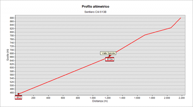 Il percorso termina ai margini del bosco (950 m), dove inizia la Val Spirola.