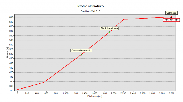 La partenza è appena fuori l'abitato di Berzo San Fermo (375 m) in direzione sud-est e, per gran parte del suo percorso, è affiancato da una strada che conduce al Rifugio Gemba (B.ta Gaiane). Subito dopo il doppio tornante si sale con dolce pendio, incontrando sulla destra le cascine Bescasolo e, poco oltre, i fienili Carminada (579 m). Dopo circa 300-350 m il sentiero abbandona la strada che lo affiancava svoltando a destra e, dopo altri 750-800 m, raggiunge la croce del Col Croce (673 m).