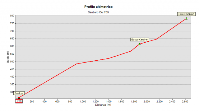 Seguendo il sentiero 708 si giunge in pochi minuti ad un bivio dal quale, proseguendo a sinistra, si imbocca il percorso 709. Il ripido versante dei Vasti, attraversato da questo tracciato, è stato nel tempo ridisegnato dall'uomo con la costruzione dei terrazzamenti sostenuti da muri di bianca pietra calcarea, sui quali oggi si rinnova la coltivazione dell'olivo; da qui si apre una larga panoramica sulle torbiere della sponda bresciana del lago. Dopo un ripido tratto in boschi radi di roverella e carpino nero, specie forestali tipiche di questi ambienti poveri d'acqua, il sentiero si congiunge al TPC (sentiero gestito dalla Comunità Montana del Basso Sebino). Seguendo per 100 metri verso destra questo segnavia, si raggiunge il nucleo rurale di Colle Cambline (785 m).