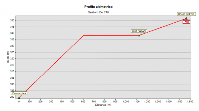 Il sentiero inizia alla chiesetta dell'Immacolata (291 m), dove sono disponibili un ampio parcheggio e un'area attrezzata; passando poco a valle della chiesetta prosegue lungo una stradina trattorabile. Il percorso procede poi in leggera salita, addentrandosi nei fitti boschi di castagno che vegetano sul versante destro della Valle del Nembra, fresco riparo dalla calura estiva. L'ultimo tratto percorre una strada rurale che termina nell'amena frazione di Dosso dell'Era (353 m).